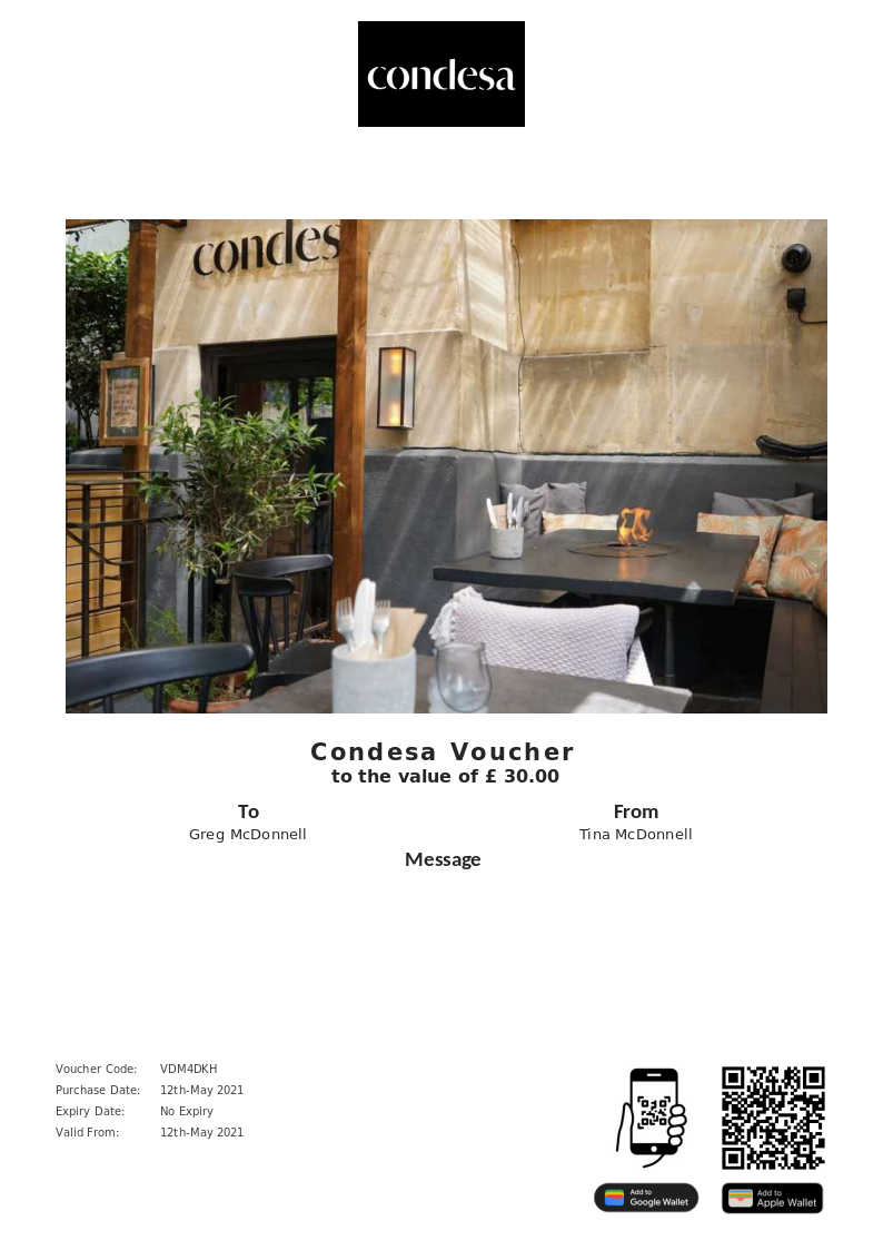 Condesa allows you to purchase instantly printable gift vouchers, special offers and tickets using the Voucher Connect platform.